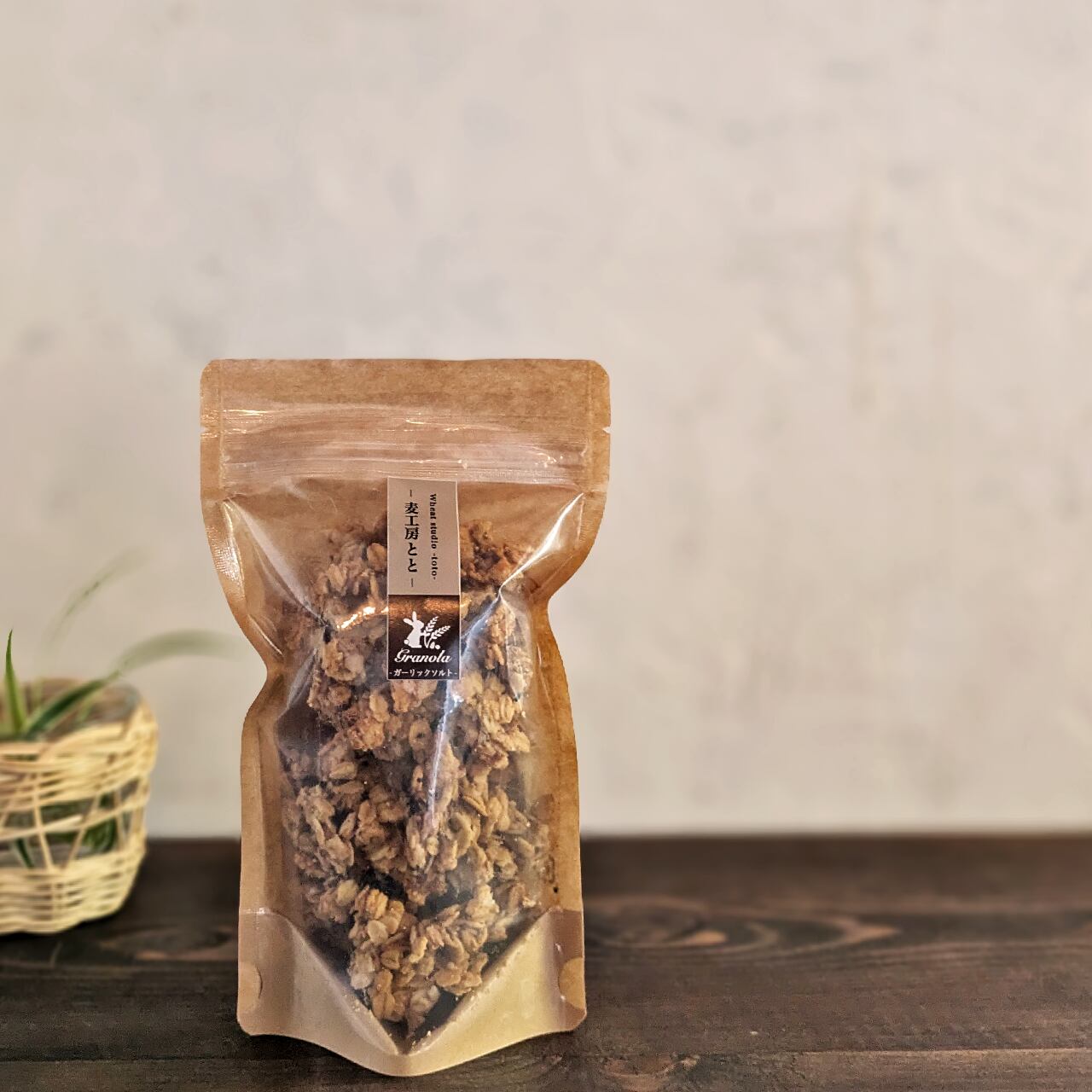 オートミール、国産米粉、北海道産石臼挽き全粒粉と胚芽を使い、香り高いにんにくと粗挽き胡椒がたっぷり入ったガツンと塩味が特徴のグラノーラです。そのままはもちろん、カレーやサラダ、スープにトッピングするだけで、味わいに深みがプラスされます。